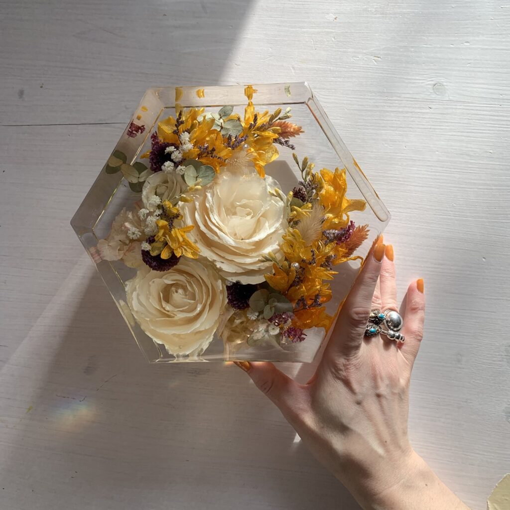 Auch ein alter Brautstrauß wird in Harz konserviert nicht nur zum echten Hingucker, er hält auch für immer und ist vor weiterem Verfall bestens geschützt.